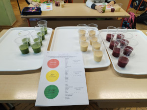 Kako bismo „začinili“ cijelu priču osmislila sam za djecu igru Smoothie semafor – isprobavali su 3 vrste smoothija (crveni, žuti i zeleni), ali nisu znali koji su im sastojci. Svaki učenik je uz smoothije dobio list papira sa sastojcima među kojima su morali prepoznati sastojke koji su u pojedinom napitku. Bilo je zanimljivo gledati njihova lica kada su oprezno približavali zeleni smoothie ustima i oduševljenje kada su otkrili da je, zapravo, jako ukusan. Listove s rješenjima su predali na pregled i onaj učenik koji je imao najviše pogodaka je osvojio nagradu. Uposlili smo i našeg ravnatelja, tajnika, računovotkinju i pedagoginju te su oni imali isti ukusni zadatak kao i djeca. Moram istaknuti tajnika Romea koji je imao najviše pogodaka od svih pa smo i njega razveselili prigodnom nagradom. Posebna hvala drugoj kuharici Aniti Grgić koja je pomagala u miksanju smoothija.